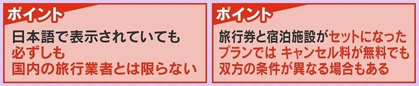 その他、旅行予約サイトを使用する際のポイントとしては、『日本語で表示されていても、必ずしも国内の旅行業者とは限らない』『旅行券と宿泊施設がセットになったプランでは、キャンセル料が無料でも、双方の条件が異なる場合もある』の2点があります。