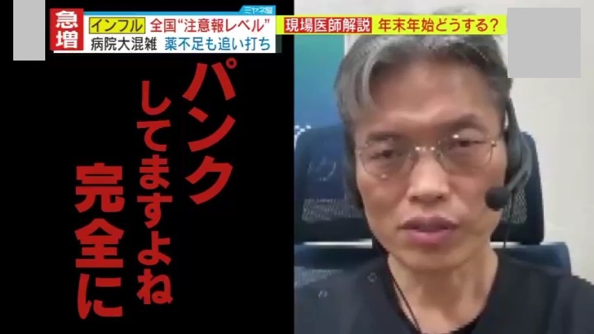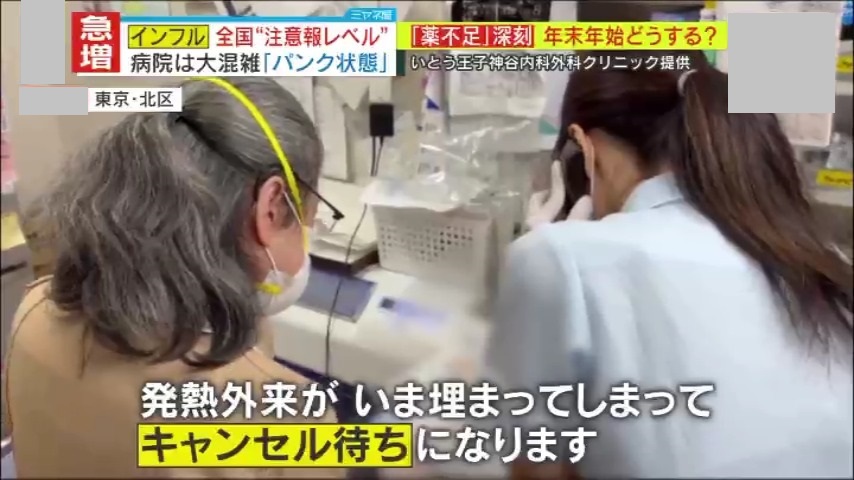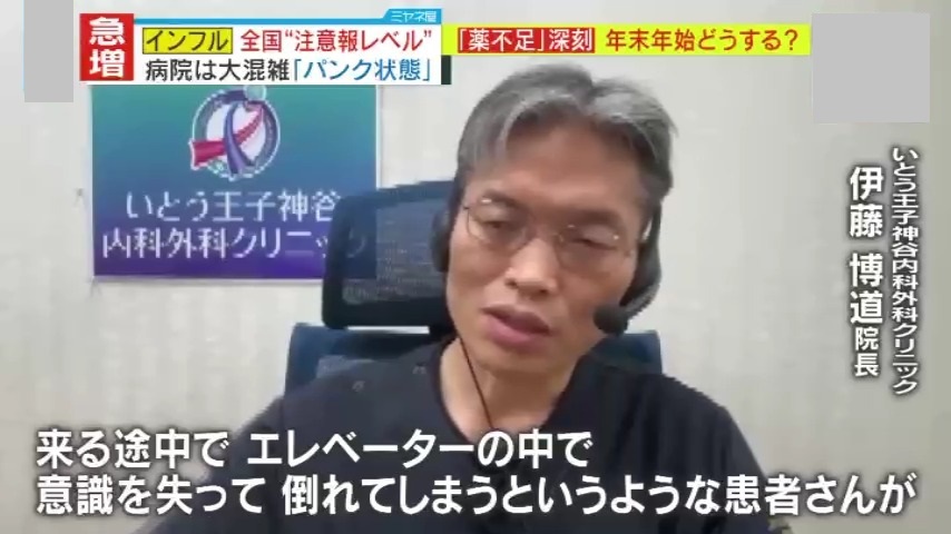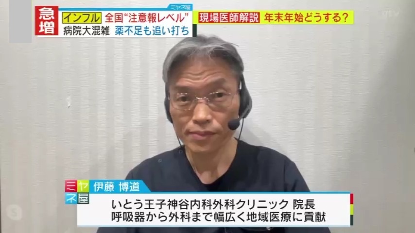 今、日本中で急拡大しているインフルエンザの感染。複数の感染症が同時流行で医療機関もパンク状態。さらには薬剤不足まで…そんな中、多くの医療機関が休みに入る年末年始に、発熱などの症状が出た場合どうすればいいのか?いとう王子神谷内科外科クリニック・伊藤博道院長の解説です。