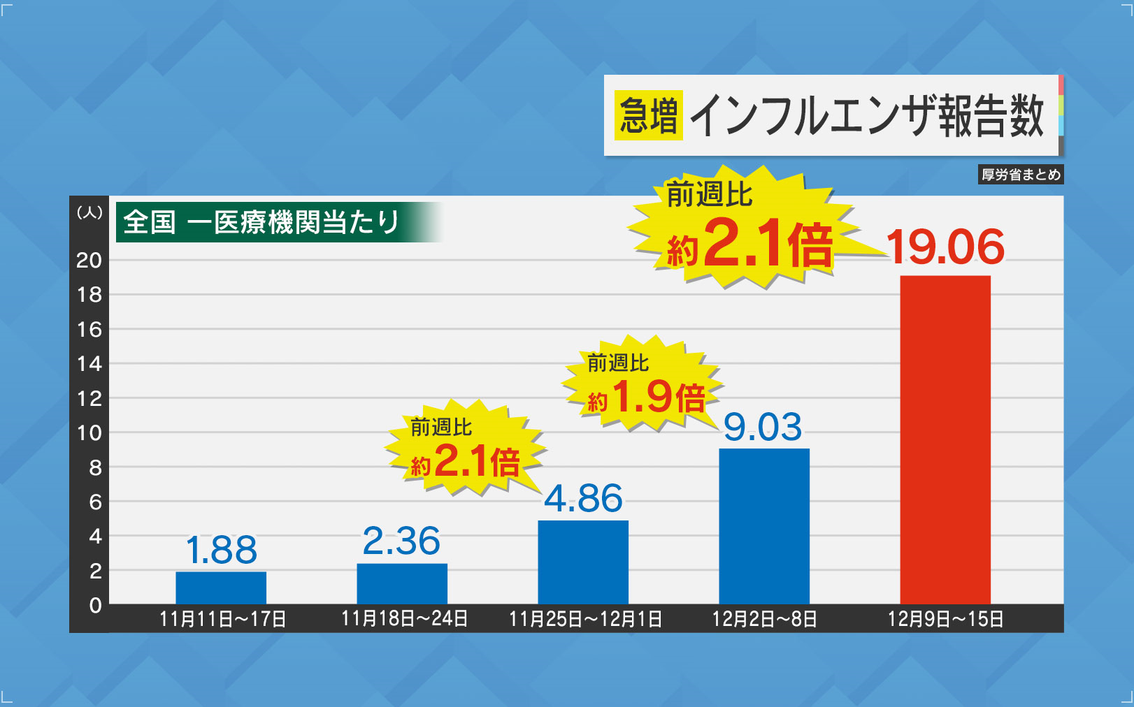 1医療機関当たりのインフルエンザ報告数は、先月下旬ごろから急増しています。1週間ごとに倍増を繰り返し、2024年12月15日までの1週間で、19.06人と、『注意報レベル』の10人を大幅に超える事態に。日々、診療する医師からは、まるでコロナ禍を思い出すような言葉が―。