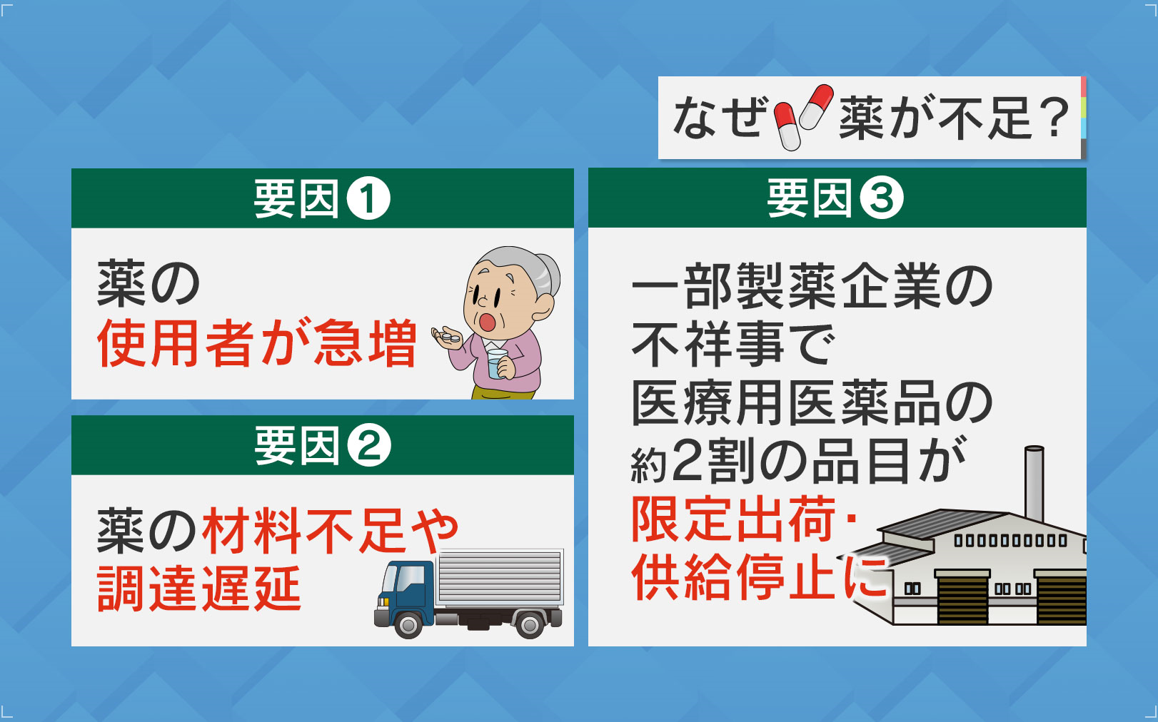 薬不足の要因としては、薬の使用者が急増したことや、薬の材料不足や調達遅延、一部製薬企業の不祥事で医療医薬品の約2割の品目が限定出荷・供給停止になったことが考えられます。