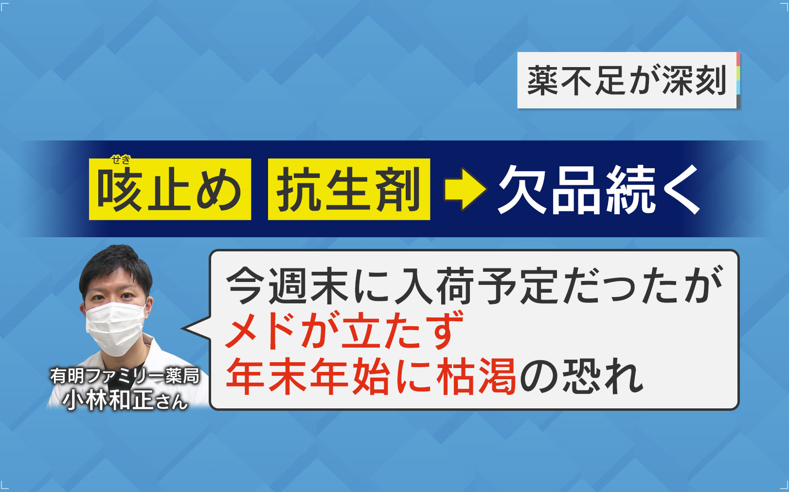 また、様々な感染症が拡大する中、深刻な問題となっているのが、薬不足です。東京都内の薬局では、先月ごろから、咳止め薬や抗生物質などの欠品が続いているといいます。現在、入荷のメドが立っていない薬は、全部で約300種類で、年末年始に薬の流通が休みでストップし、さらなる深刻化が予想されています。