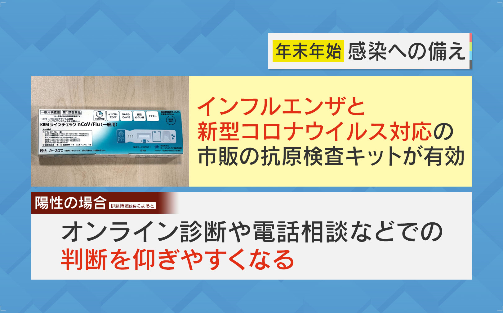 「これはコロナとインフルの同時キット。これは非常に有用です。1回目の検査をこれでやって、2回目の検査を、ちょうど発症から1日目、2日目のあたりが検査のゴールデンタイムなので、そこに充てるなど、2回病院を受診するというのは大変ですが、1回これをやっておくことで、ずいぶん道が開けると思います。店舗に、売り切れの場合もありますが、インターネットとかで買えるものもあるので、この準備も有効だと思います」