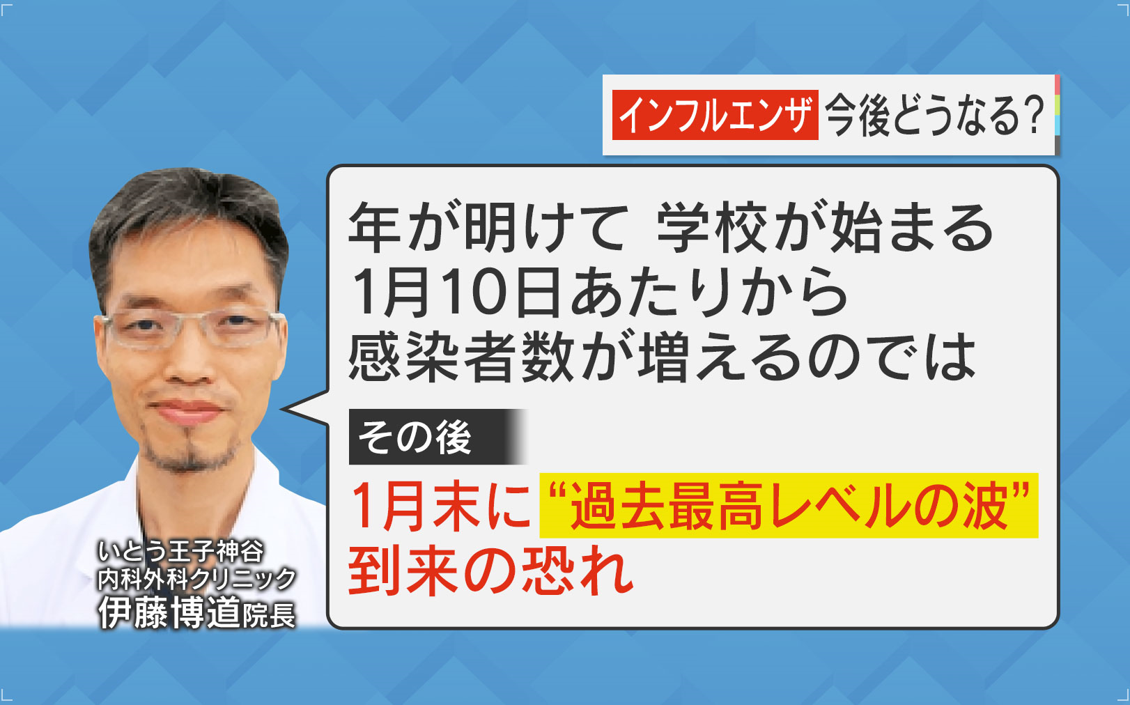 今後のインフルエンザについて、伊藤院長は「年が明けて学校が始まる(2025年)1月10日あたりから感染者数が増え始めるのでは。その後1月末に“過去最高レベルの波”到来の恐れ」と話しています。