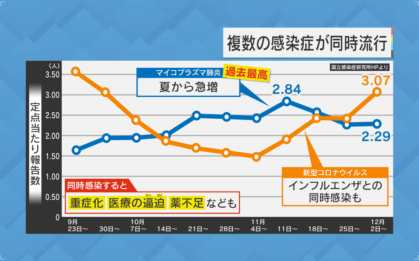 そして複数の感染症が同時流行しています。マイコプラズマ肺炎は、夏から急増し2024年11月中旬の定点当たりの報告数が過去最高となりました。そして新型コロナウイルスは最近また増えてきました。インフルエンザとの同時感染も見られるとのことです。