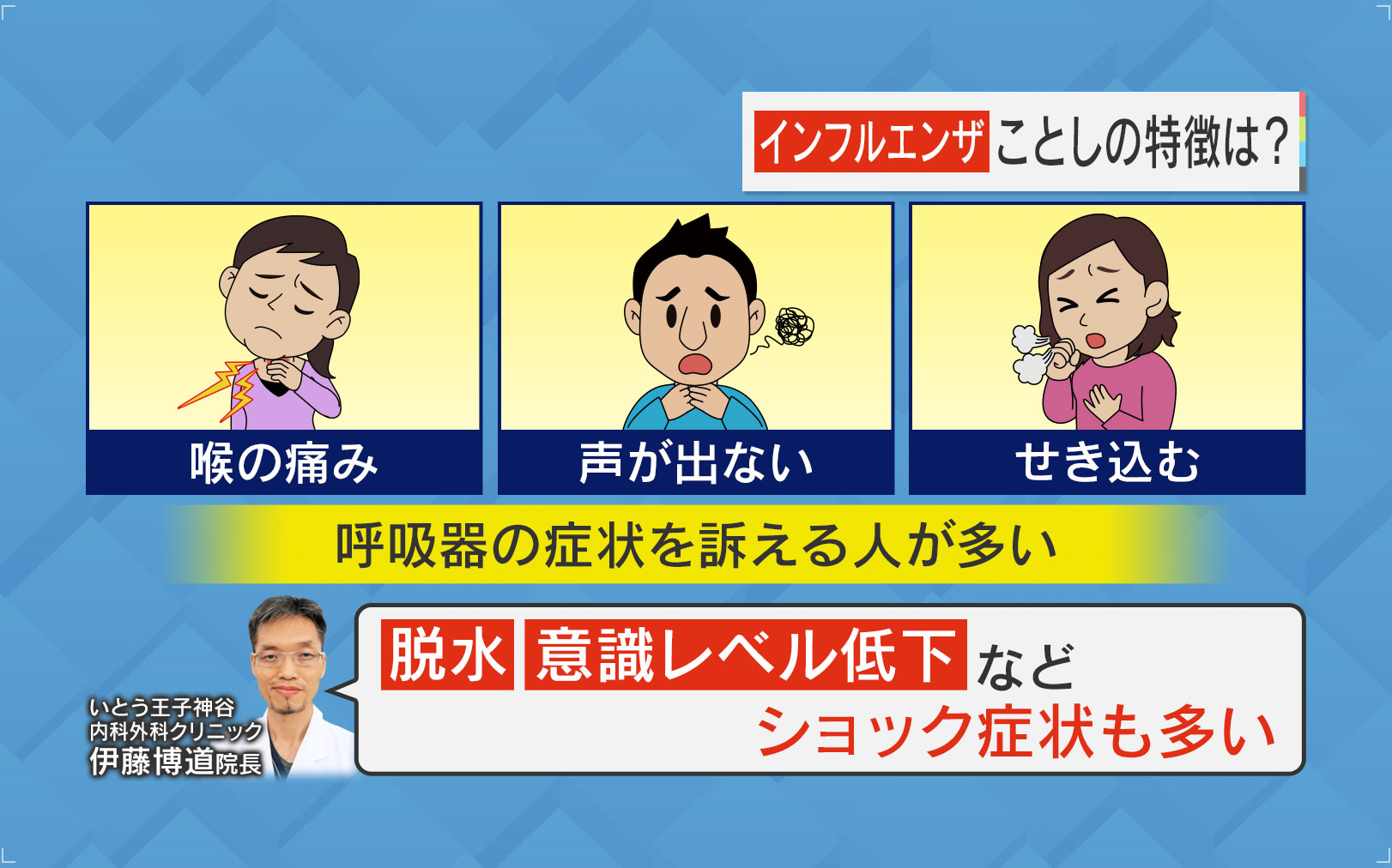 今回のインフルエンザの特徴は、喉の痛みや声が出ない、せき込むなどの呼吸器の症状を訴える人が多いといいます。伊藤院長によると「脱水・意識レベル低下などショック症状も多い」とのことです。
