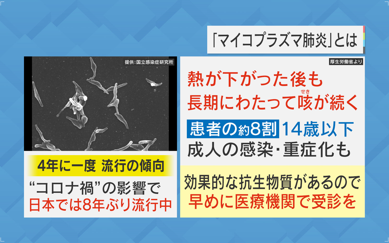 『マイコプラズマ肺炎』とは、4年に一度は流行の傾向にあるそうですが、“コロナ禍”の影響で日本では8年ぶりに流行中です。熱が下がった後も長期にわたって咳が続き、患者の約8割が14歳以下で、成人の感染や重症化も見られます。効果的な抗生物質があるので、早めに医療機関で受診を勧められています。