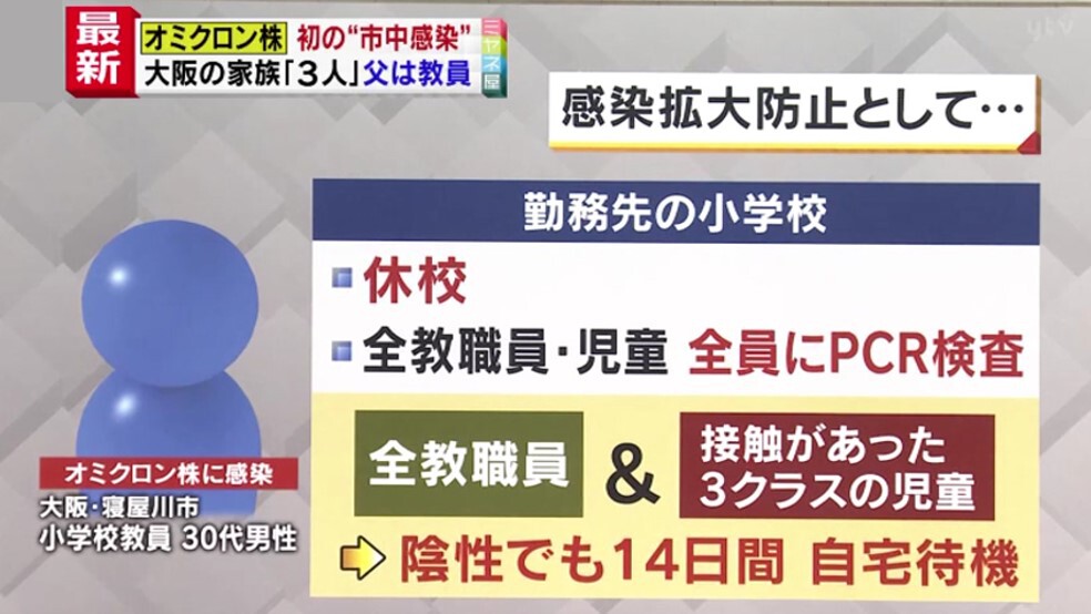 30代の男性は寝屋川市の小学校の教員で、12月17日まで学校に出勤。18日から発熱などの症状が出たため検査し、22日に「オミクロン株」に感染したことが判明しました。この教員と接点があった3つのクラスの児童と全教員は、PCR検査で陰性でも14日間の自宅待機という処置がとられました。