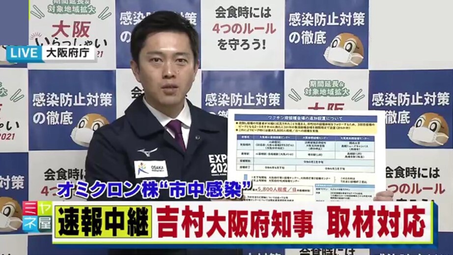 また、大阪府の吉村知事は12月23日の会見で、「今後、オミクロン株の感染が拡大することが予測されます。様々な対策を実証していくことになります。そのうちの一つとして、ワクチンの3回目接種が非常に重要になってくると、専門家から意見を聞いています。ですのでワクチンの3回目接種を、高齢者の方などリスクのある方にできるだけ早くするため、大規模接種会場を新たに3か所追加して、合計6か所の大規模接種会場を設置します。」と今後の対策について発表しました。