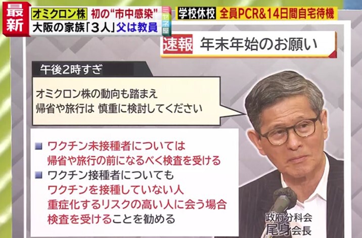 政府分科会の尾身会長は12月23日の会見で、「年末年始は、一年のうちで最も感染が拡大しやすい時期であり、また、オミクロン株の動向も踏まえ、帰省や旅行は慎重に検討してください。オミクロン株は急速に感染拡大する可能性があり、“スポット”の感染が更なる感染につながると、短期間で多数の患者発生が予想され、その中から当然一定程度の重症者も生じ得ることから、ここに来て強化されてきた医療制度ですら、ひっ迫してしまう可能性があると思う。」と述べました。