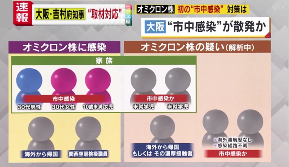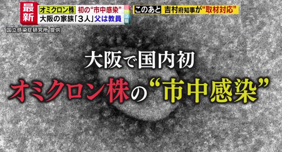国内で初めて確認された、大阪での「オミクロン株」の“市中感染”。12月22日に感染が分かった3人は、5人家族の30代の夫婦と10歳未満の娘で、発熱などの症状で入院したということです。大阪府の吉村知事は22日の会見で「海外の渡航歴なし、感染経路不明。これは“市中感染”にあたると思います。」と発表しました。