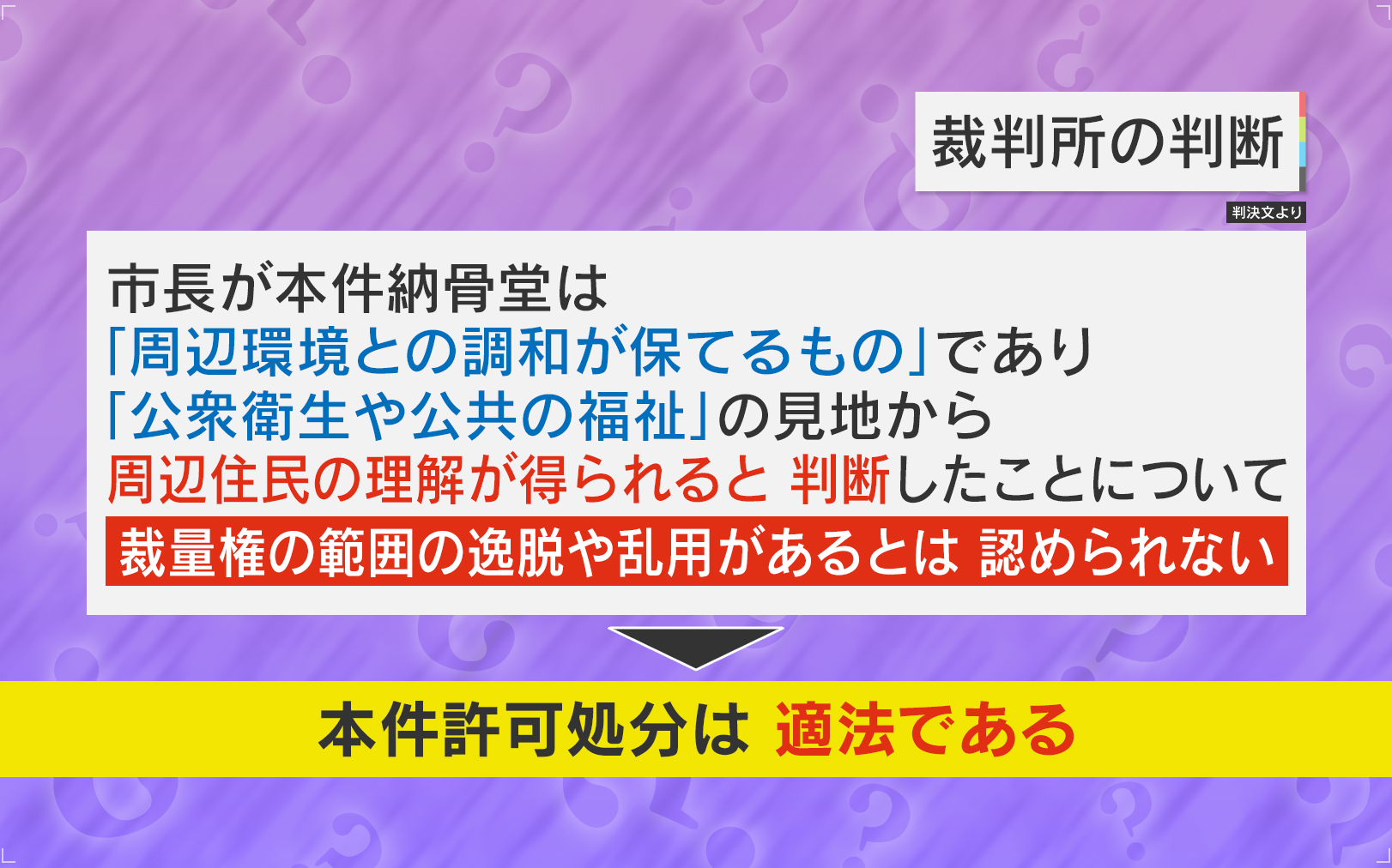 Q.裁判所の判断としては、納骨堂は一見マンションに見えるので、市長が「環境は保てている」と判断したことは問題ないということですか?