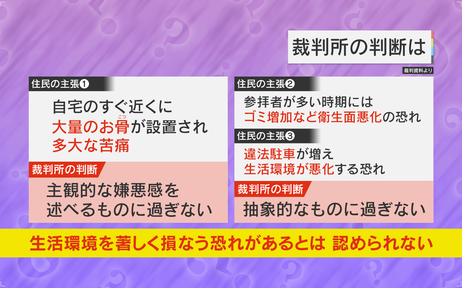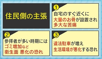 住民側の主張は、『①自宅のすぐ近くに大量のお骨が設置され、多大な苦痛』『②参拝者が多い時期にはゴミ増加など衛生面悪化の恐れ』『③違法駐車が増え、生活環境が悪化する恐れ』というものです。