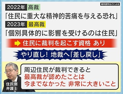 ただ、2022年の高裁では「住民に重大な精神的苦痛を与える恐れがある」、2023年の最高裁では「個別具体的に影響を受けるのは住民」だとして、住民に裁判を起こす資格はあると判断され、地裁へ『差し戻し』に。住民側の弁護士は、「周辺住民が裁判できると最高裁が認めたことは今までなかった。非常に大きいことだ」と話していました。