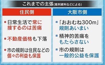 裁判資料などによると、これまで住民側が「日常生活で常に接するのは苦痛」「不動産価格も下落」「市の規則は住民などの個々の利益も保護すべきだ」と主張してきた一方、大阪市側は「『おおむね300m』の規則はあいまい」「精神的苦痛をもたらさない」「市の規則は一般的公益を保護している」と反論してきました。