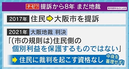 住民が大阪市を提訴したのは2017年ですが、2021年に大阪地裁は「(市の規則は)住民側の個別利益を保護するものではない」との判決を出し、“住民に裁判を起こす資格なし”として中身を審理しませんでした。