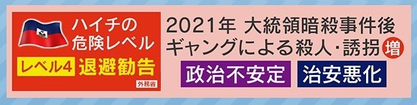 ハイチ共和国は、2021年に大統領が暗殺されてからギャングによる殺人・誘拐が増え、政治不安定・治安悪化など極度の混乱状態に。2025年1月からの3か月で、ギャングによる襲撃や警察の治安活動などで、少なくとも1500人以上が死亡、500人以上が負傷しています。国連によると、首都の85%をギャングが支配していて(2024年時点)、外務省によるハイチの危険レベルはレベル4『退避勧告』となっています。