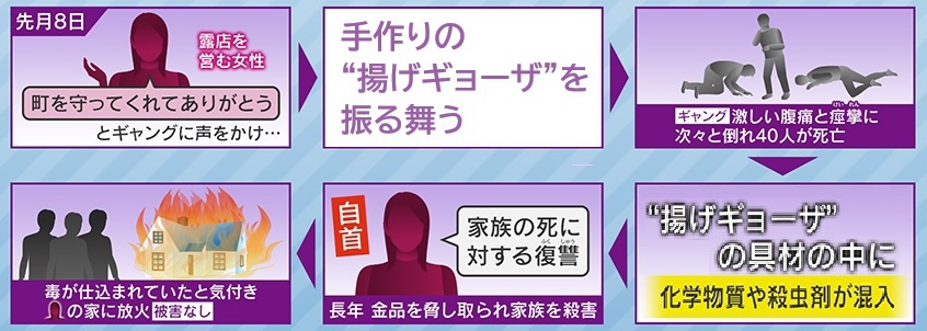 自首した女性は、「家族の死に対する復讐だ」と話しました。女性は、長年金品を脅し取られ、家族を殺害されていたのです。その後、生き残ったギャングらは毒が仕込まれていたと気づき、女性の家に放火しましたが、被害はなかったということです。