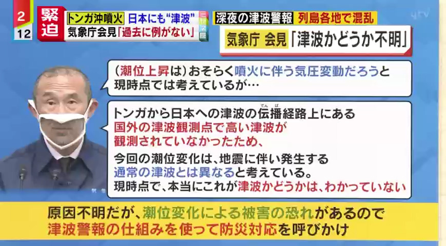 「潮位の上昇は恐らく噴火にともなう気圧変動だろうと現時点では考えていますが、トンガから日本への津波の伝播経路上にある国外の津波観測点で高い津波が観測されていなかったため、今回の潮位変化は地震にともなって発生する通常の津波とは異なると考えています。現時点で本当にこれが津波かどうかは分かっていません。気象庁は、『原因はわからないが潮位変化による被害のおそれがあるので、津波警報の仕組みを使って防災対応を呼びかけた』ということです。」