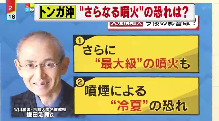 「まだマグマが上がり始めただけですから、どうなるか分らない、もっと大噴火をすると、カルデラといって、マグマが出て陥没するんです。そうなると大きな津波も発生するかもしれません。もう1つは気候変動です。大量の火山灰が出ると、地球を火山灰が覆って寒冷化が起きるんです。今回の噴火は、1991年にフィリピンのピナツボで起きた噴火と同じぐらいの規模なんですが、ピナツボ噴火のあと、気温が0.5度ぐらい下がったんです。その時は記録的な冷夏になって、米不足で『平成の米騒動』といわれました。しかし、本当に怖いのは、次の最大級の噴火です。今回の噴火でエネルギーが抜けたわけではなく、始まりだとすると、今後カルデラ噴火を起こしたら海底が1回沈んで、そこに海水が入ってまた爆発する。そうすると世界中を波が襲うわけです。」