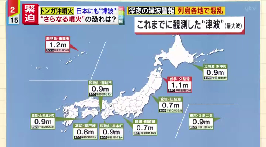 1月15日午後1時頃、南太平洋のトンガ諸島で、大規模な噴火が発生、衛星画像でみると、噴煙の広がりは、半径300kmに及びました。そして、午後7時、気象庁は『日本の沿岸では、若干の海面変動が起きる可能性はあるが被害の心配はない』と発表した1時間後、日本の全国各地で急激な気圧変化を観測。その後、“異例の潮位上昇”がみられ、気象庁は鹿児島県の奄美群島、トカラ列島、岩手県に津波警報、太平洋沿岸などに津波注意報を発表しました。