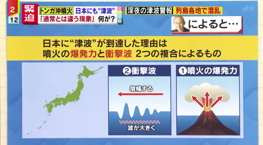 「衝撃波というのは空気の振れです。その空気の振れが先に日本に来て、津波を作ったんです。非常に珍しい現象です。例えば、東日本大震災においても海底が隆起して、20mぐらいの津波が来たわけです。その場合順番に来るのでわかりやすい。今回、飛び越してきたというのは衝撃波によるもので、海底の断層がずれたのとは違うメカニズムです。」