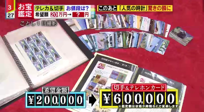 テレホンカードや切手は基本的に額面で価値が決まると言いますが、発行枚数が少ないと価値が上がります。過去の「おたからや」でも、プレミアムが付いた高額の査定が何度も出ています。今回はどうなるでしょう…