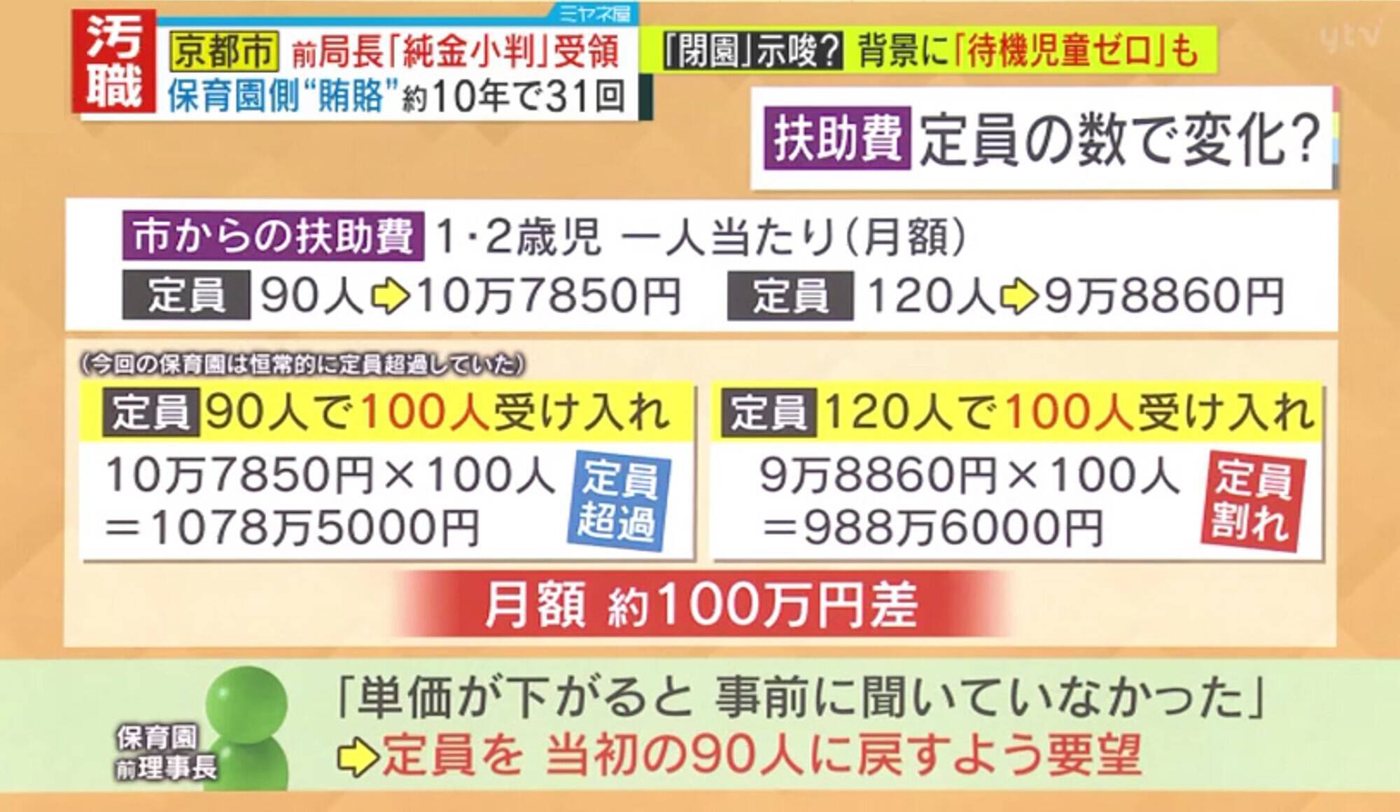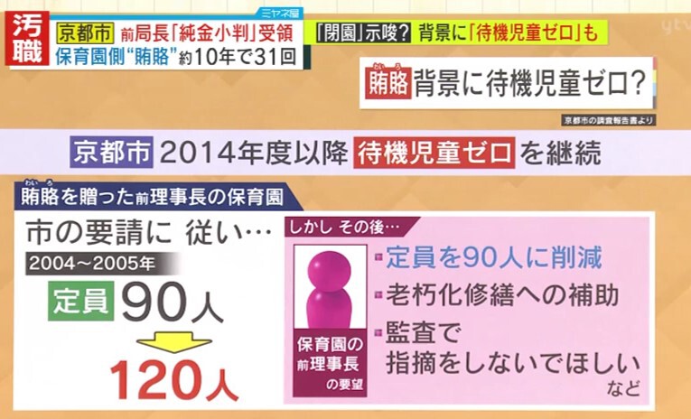 この事件の背景には、「待機児童ゼロ問題」があったとみられます。京都市は2014年以降、待機児童ゼロを継続していますが、賄賂を贈った前理事長の保育園も、そうした京都市の要請に従い、2004年~2005年の間、定員90人だったところを120人に引き上げたということです。しかし前理事長はその後、「定員を90人に減らしてほしい」と要望したということで、その理由は、京都市からの“扶助費”が定員の設定によって変わることが背景ではないかとみられています。