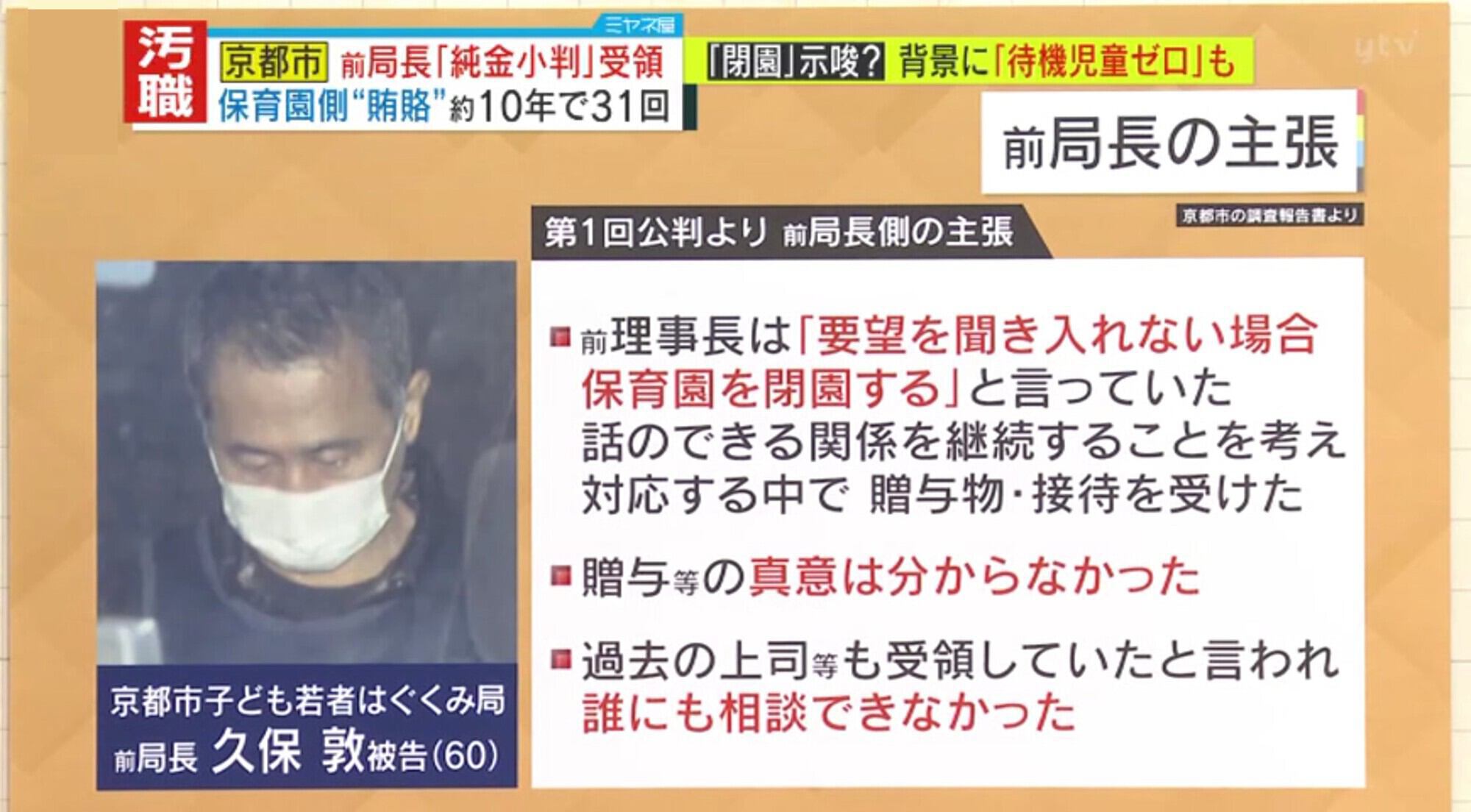 収賄の容疑で逮捕・起訴されたのは、京都市「子ども若者はぐくみ局」の前局長・久保敦被告(60)です。久保被告は、「セヴァ子ども学園」の前理事長(86)から、45万円相当の高級腕時計や、40万円相当の純金の小判を、『監査で便宜を図ってほしい』という意図を承知の上で受け取ったなどの疑いがもたれています。