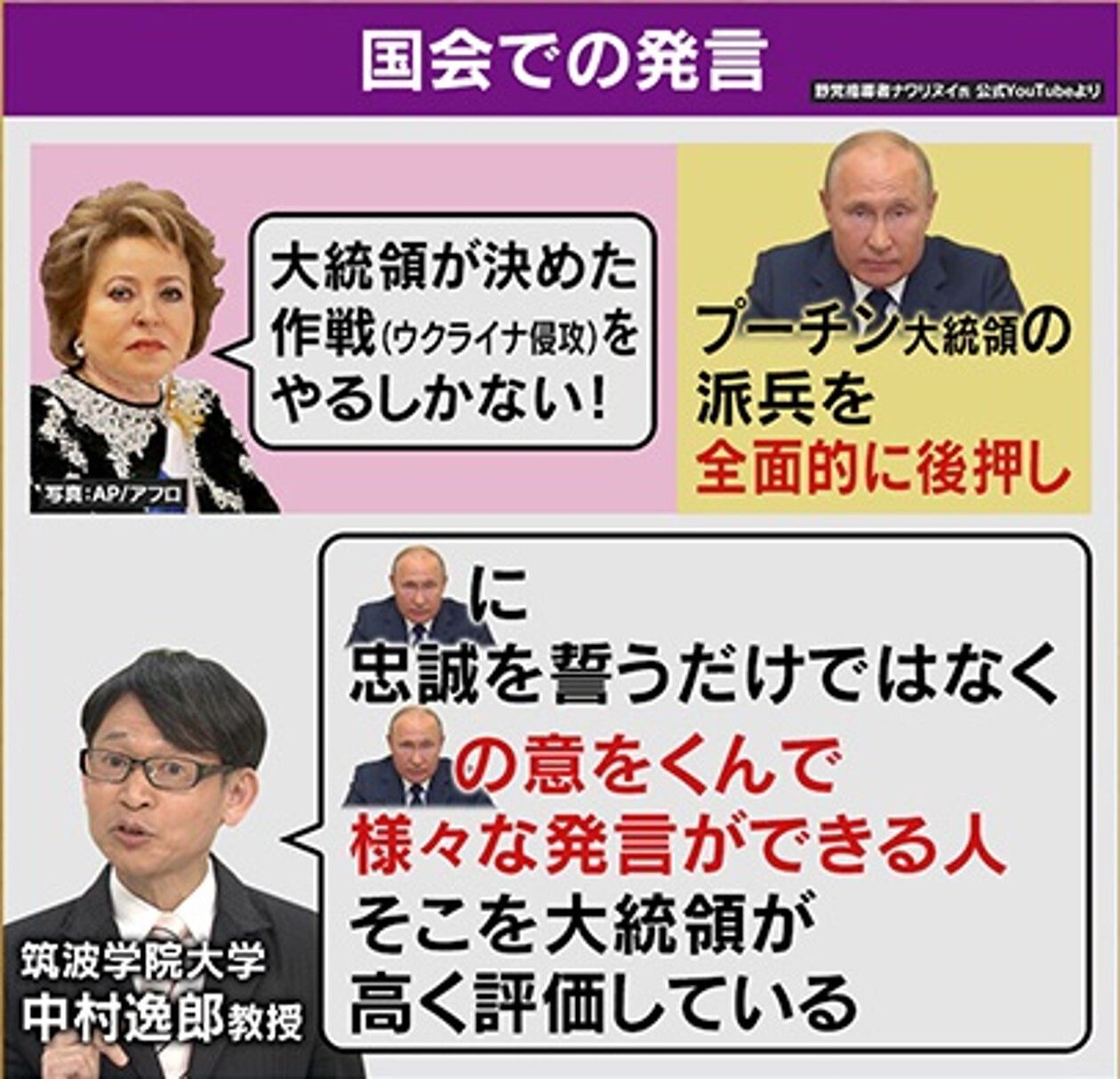 ロシアの国会では、プーチン大統領のウクライナ派兵を全面的に後押して「今回の“特別軍事作戦”は戦火を止めるためのもので、そのためには軍事作戦を行うしかありません!」とロシア議会のトップとして、派兵を全面的にサポートする発言をしています。筑波学院大学の中村逸郎教授によると「一時期、プーチン大統領に影響力を持っている人の中でNo.1だろうという話もあり、日本でも北方領土問題の交渉をするなら『まず最初にマトビエンコ氏を窓口にすべき』と言われていました。プーチン大統領に忠誠を誓うだけでなく、大統領の意をくんで様々な発言ができる人です」ということです。プーチン大統領からも高く評価されていて「現代ロシアの“女帝”」とも呼ばれています。
