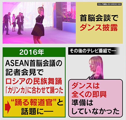 また、2016年のASEAN(東南アジア諸国連合)首脳会議で、ロシア民謡の「カリンカ」に合わせてダンスをして、“踊る報道官”と話題になりました。Facebookでも情報発信を行っていて、親しみやすい一面もある一方で、誰に対してもストレートにものを言う人物でもあります。中村教授によると「外交政策における、プーチン大統領の一番のスポークスパーソンで、それが正しいか間違っているかはともかくとして、どんなに“欧米から批判”を受けてもブレないというのが最も大きな特徴です。芯の強さとやわらかさを兼ね備えた“ミニプーチン”と言える存在で、プーチン外交の秘蔵っ子といえます。プーチン大統領は、ラブロフ外相よりザハロワ報道官の方を信頼しているのでは?」ということです。