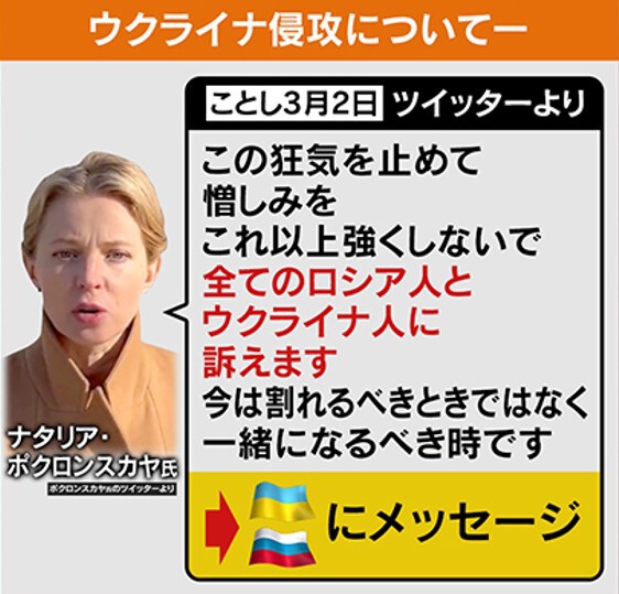 ポクロンスカヤ氏はツイッターでも「この狂気をとめて、憎しみをこれ以上強くしないで、全てのロシア人とウクライナ人に訴えます。今は割れるべきときではなく、一緒になるべきときです」とつぶやいています。