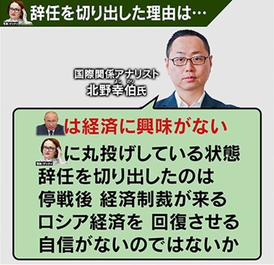 「ナビウリナ氏ならなんとかやってくれるであろうという信頼があると思います。プーチン大統領は経済に興味がなく、彼女に丸投げにしているのですが、彼女が辞任を切り出したのは、今回のウクライナ侵攻の停戦後に、ロシア経済を回復させる自信がないからだと思います」