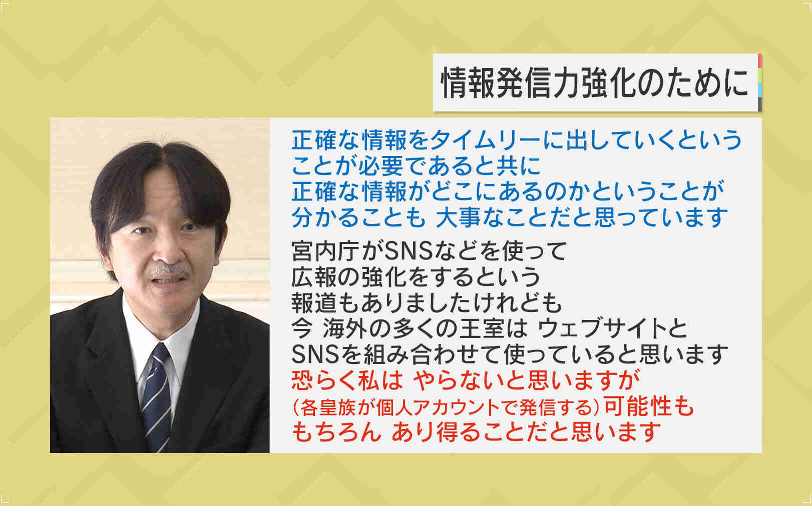 さらに秋篠宮さまは、皇室の情報発信について、「正確な情報をタイムリーに出していくということが必要であるとともに、正確な情報がどこにあるのかということが分かることも、大事なことだと思っています。宮内庁がSNSなどを使って、広報の強化をするという報道もありましたけれども、今、海外の多くの王室は、WEBサイトとSNSを組み合わせて使っていると思います。恐らく私はやらないと思いますが、(皇族が各個人アカウントで発信する)可能性も、もちろんあり得ることだと思います」と語られました。