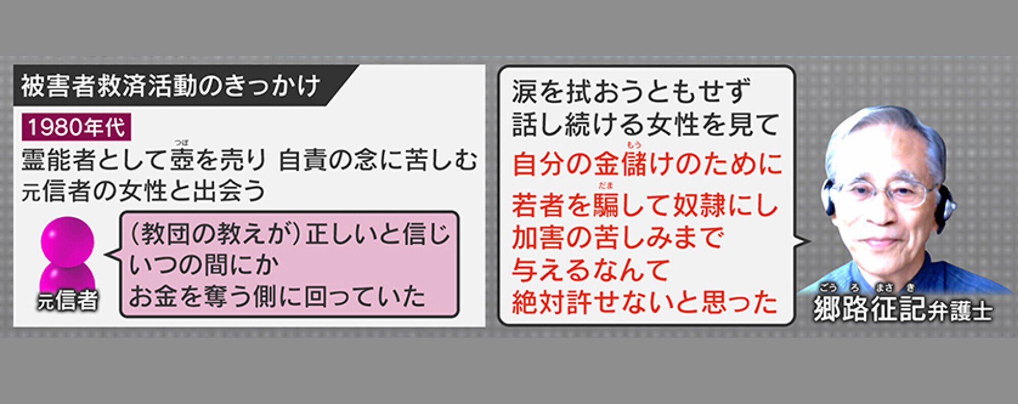 郷路弁護士が、教団被害者の救済活動を行うようになったきっかけは、1980年代に出会った“統一教会”の元信者の女性だったと言います。元信者の女性は霊能師役として壺を売り、自責の念に苦しんでおり、「教団の教えが正しいと信じ、いつの間にかお金を奪う側に回っていた」と話したそうです。その発言を聞いた郷路弁護士は「涙を拭おうともせず話し続ける女性を見て、自分の金儲けのために若者を騙して奴隷にし、加害の苦しみまで与えるなんて絶対許せない」と思い、被害者救済活動に取り組み始めたということです。