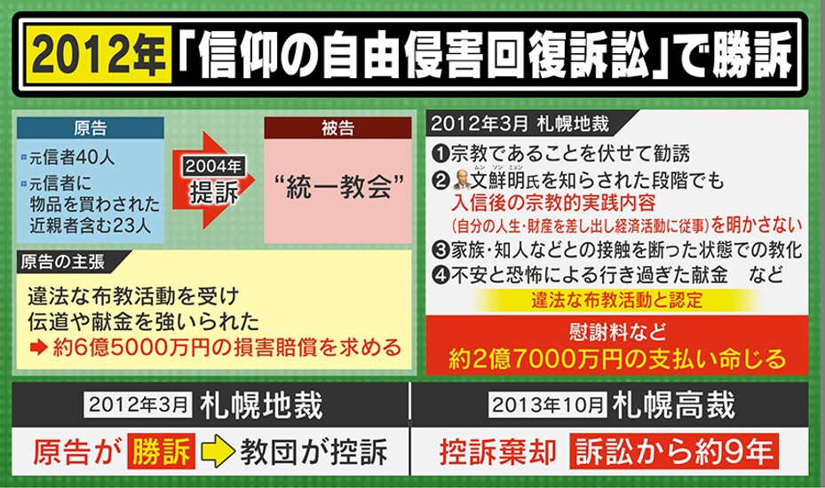 さらに2004年、元信者40人と元信者を通して物品を買わされた近親者を含む23人が、“統一教会”を相手取り裁判を起こしました。2012年に札幌地裁は、教団の違法な布教活動を認定し、慰謝料など約2億7800万円の支払いを命じました。教団は控訴しましたが、2013年に札幌高裁は控訴を棄却しています。訴訟からは約9年が経過していました。