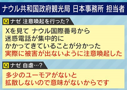 「Xを見て、ナウル国際番号から迷惑電話が集中的にかかってきていることが分かった。実際に被害が出ないように注意喚起した」