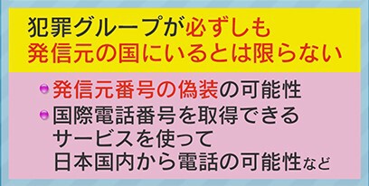 しかし、「その犯罪グループが必ずしも発信元の国にいるとは限らない」ということで、「発信元番号の偽造の可能性」や「国際電話番号を取得できるサービスを使って日本国内から電話の可能性」などもあるということです。