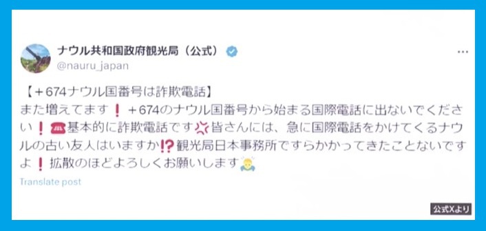 「+674ナウル国番号は詐欺電話」と題して「また増えてます!+674ナウル国番号から始まる国際電話に出ないでください! 基本的に詐欺電話です(怒) 皆さんには、急に国際電話をかけてくるナウルの古い友人はいますか?観光局日本事務所ですらかかってきたことないですよ!拡散のほどよろしくお願いします」