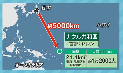 ナウル共和国ですが、首都はヤレン。オーストラリアの北辺りにあり、日本からの直線距離は約5000km、面積は21.1㎢と東京都の品川区とほぼ同じです。人口は約1万2000人だということです。