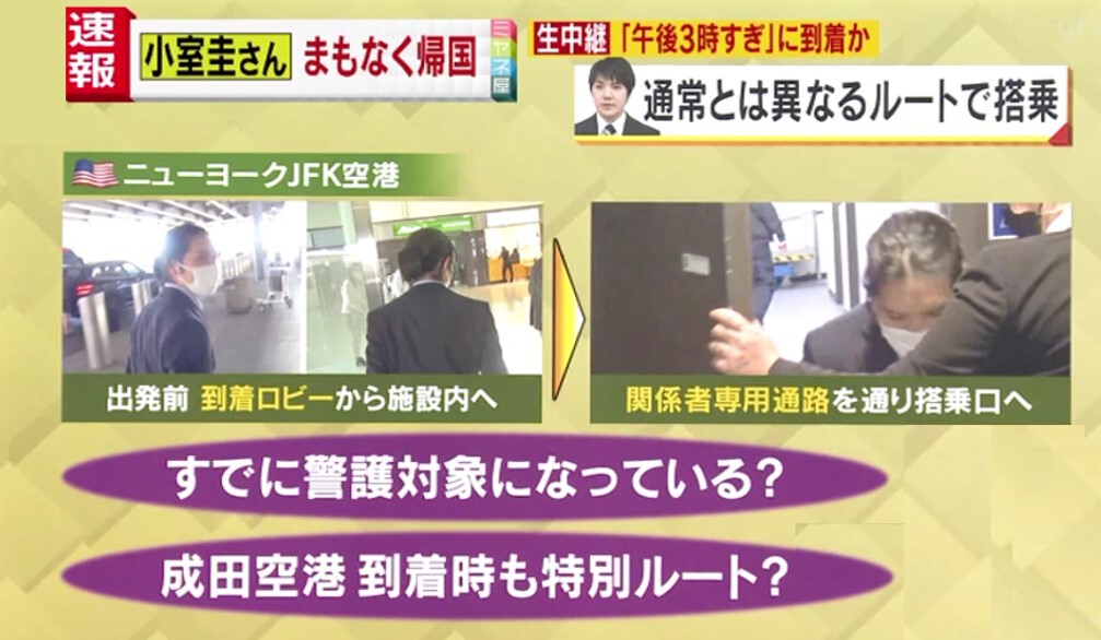 帰国に伴い、小室さんの実家にも簡易派出所ができましたが、実は、ニューヨークでも特別な動きが…。ニューヨークの空港では、出発前にもかかわらず、到着ロビーから施設内に入り、その後、関係者専用通路を通って搭乗口へと向かうという動きが確認されました。