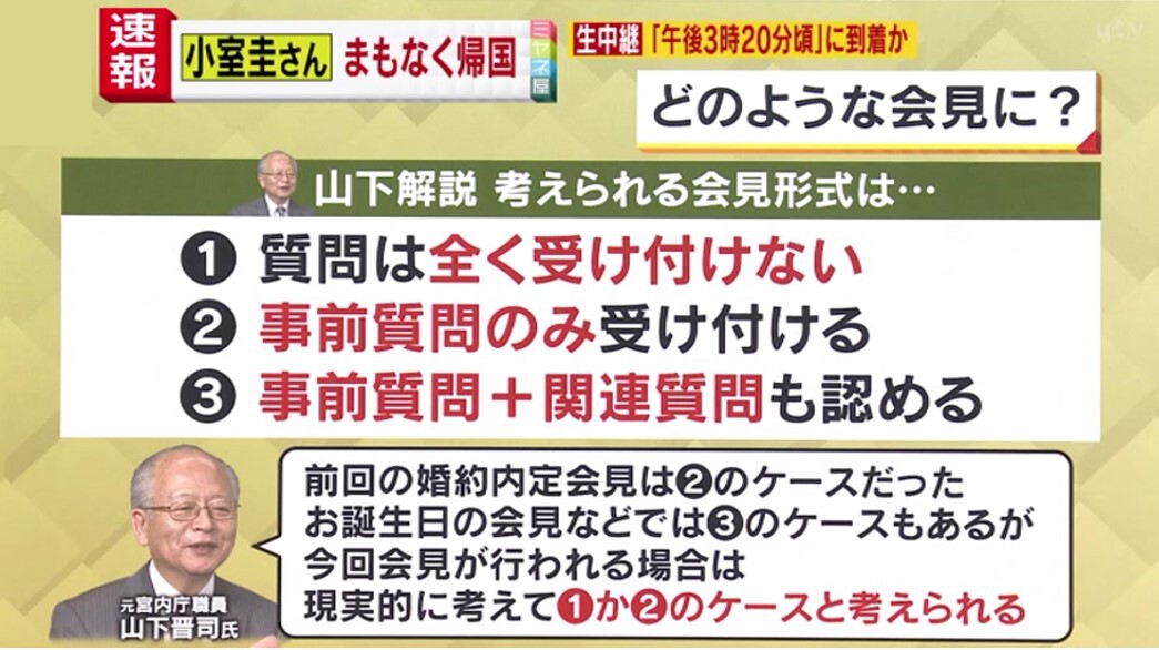 お二人の会見について、山下さんによりますとパターンは3つ考えられます。1つ目、質問は全く受け付けないケース。2つ目、事前質問のみ受け付けるケース。3つ目は、事前質問に加え関連質問も認めるケースです。前回の婚約内 定会見は、2つ目の事前質問のみ受け付けるケースでした。お誕生日の会見などでは3つ目の関連質問を認めるケースもありますが、今回会見が行われる場合は、現実的に考えて、質問を全く受け付けないか、事前質問のみのパターンではないかということです。