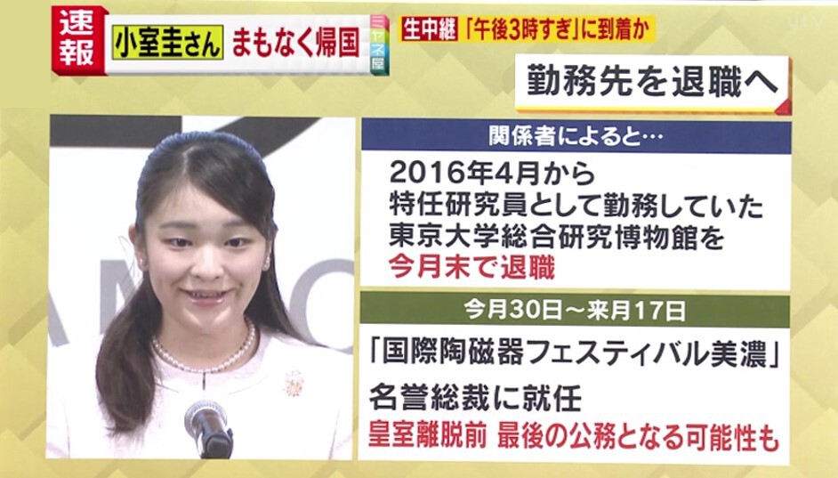 眞子さまは勤務先を退職するということです。関係者によりますと、眞子さまは2016年4月から特任研究員として勤務をされていました東京大学総合研究博物館を、9月末で退職されるということです。一方で、9月30日~10月17日にかけては、「国際陶磁器フェスティバル美濃」の名誉総裁を務められ、これが皇室離脱前の最後の公務となる可能性もあります。