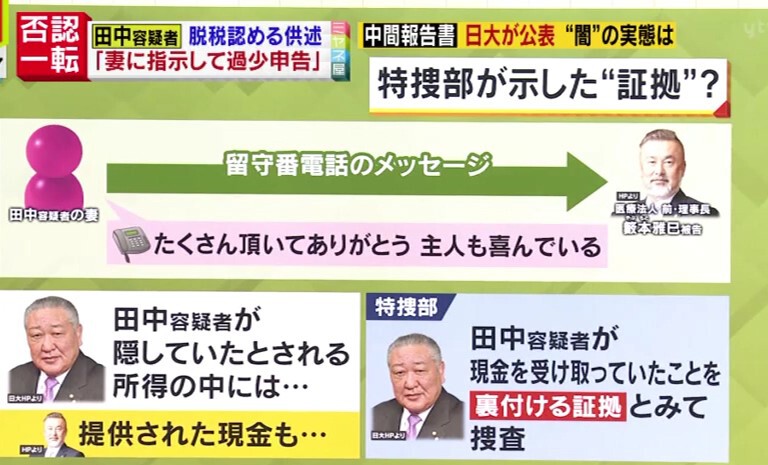 田中容疑者の脱税について特捜部が示した証拠に、田中容疑者の妻が医療法人前理事長・籔本被告に残した留守番電話があります。田中容疑者の妻が「たくさん頂いてありがとう、主人も喜んでいる」という内容のものでした。田中容疑者が隠していたとみられる所得の中には、籔本被告から提供された現金もあるとみられており、これを裏付ける証拠とみて捜査が進められています。