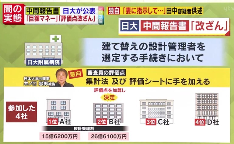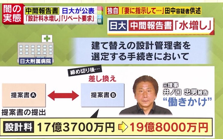 さらに、日大附属病院の建て替えの設計管理者を選定する手続きにおいて、最初に出された提案書が差し換えられ、元々17億3700万円だった設計料が、19憶8000万円になっていたという「水増し」も、井ノ口被告の“働きかけ”によって行われたとされています。