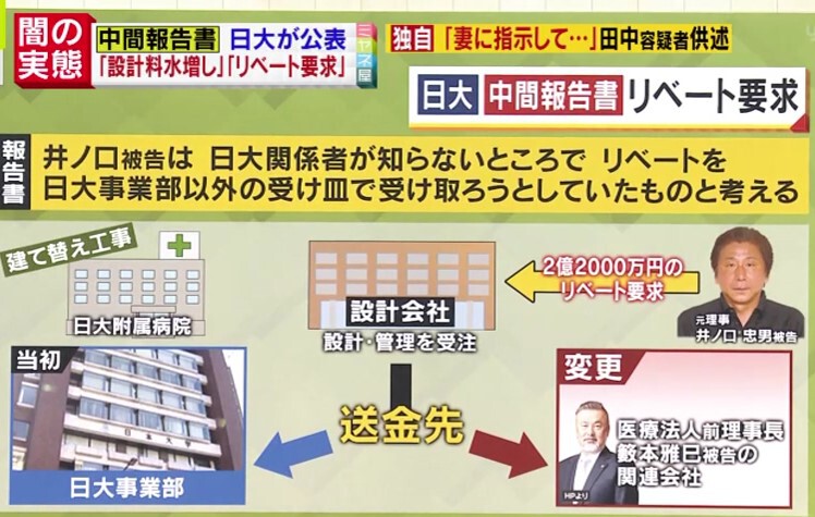 そして、日大附属病院の建て替え工事を巡り、設計・管理を受注した設計会社に対して、井ノ口被告が2億2000万円のリベートを要求、その送金先が、井ノ口被告の指示のもと、医療法人前理事長・籔本雅巳被告の関連会社に変わっていたとされる背任事件。日本大学は中間報告書で、「井ノ口被告は日大関係者が知らないところでリベートを、日大事業部以外の受け皿で受け取ろうとしていたものと考える」と記しました。