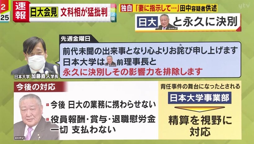 「少なくとも、『田中前理事長や井ノ口容疑者と、今後永久に決別します』と言っていますが、その決別するというのは具体的にどういう方法なのか?あるいはその部下がまだ山のようにいるはずなんですが、その部下に対しての調査はこのようにします、など、今後改めて記者会見をして方向性を示さないと、なかなか日本大学は信頼されないのかなと見ています」