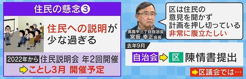 そして、住民への説明が少な過ぎることも懸念されています。住民説明会は2022年から年に2回開催されていて、2025年3月にも開催されるということですが、高島平三丁目自治会・宮坂幸正会長は、「区は住民の意見を聞かず、計画を押し切っている。非常に腹立たしい」と話していて、2024年9月には自治会として区に陳情書を提出しました。