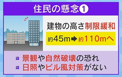 ただ、現在は約45mの『建物の高さ制限』が、タワーマンション建設のため約110mに緩和されるということで、住民は『景観や自然破壊の恐れ』『日照やビル風対策がないこと』などを懸念しています。