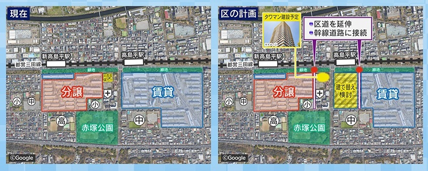 板橋区は、高さ制限緩和については「限られた土地に住宅や広場の整備を行い、高島平らしいゆとりのある空間形成のため、高さ制限の緩和は必要」、道路整備については「将来を見据えた交通を円滑に処理できる道路ネットワークを再構築していくことが必要」、住民への説明については「今後、段階的に計画が明らかになっていくものなので、その都度ご理解いただけるよう引き続き対応していく」との見解を示しました。