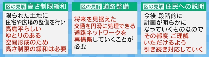 一方で、自腹で『再整備反対』のビラを作成し、毎朝通勤する住民たちに配っているという夫妻は区の見解に対し、「『地域の持続的な発展』など、全ての回答が抽象的な表現に終始していて、具体的なものが全く見えない。私たちは全てに反対し白紙撤回を求めているのではなく、110mの緩和制限と区道延伸の必要性、この2点について納得できるように説明してほしい」と強調していました。